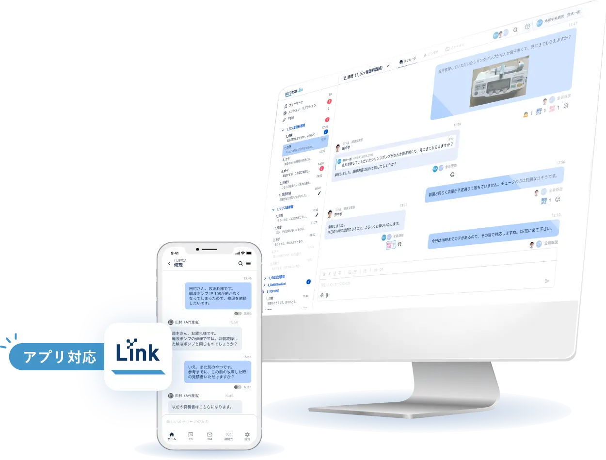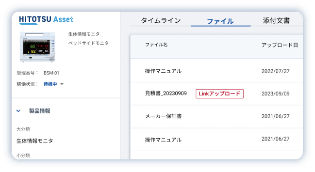 Link上でやりとりされた電子ファイル(見積書等)を、HITOTSU Assetに登録されている機器に自動紐づけ。書類や電子ファイルの授受・登録の二度手間を軽減